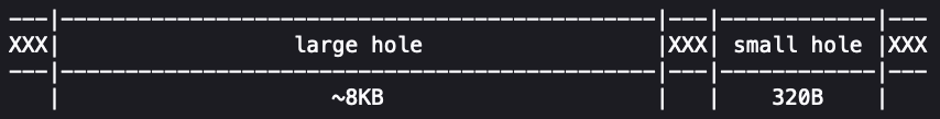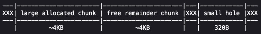 In the final heap layout, there should be a free 8KB chunk and a small free chunk of 320 bytes separated by “chunk barriers” that isolate free memory blocks.