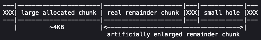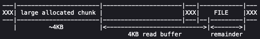 fopen()allocates itsFILEstructure into the small 320-byte chunk.__fread_unlocked()overwrites the free 4KB block with a read buffer, corrupting part of theFILEstructure allocated byfopen().